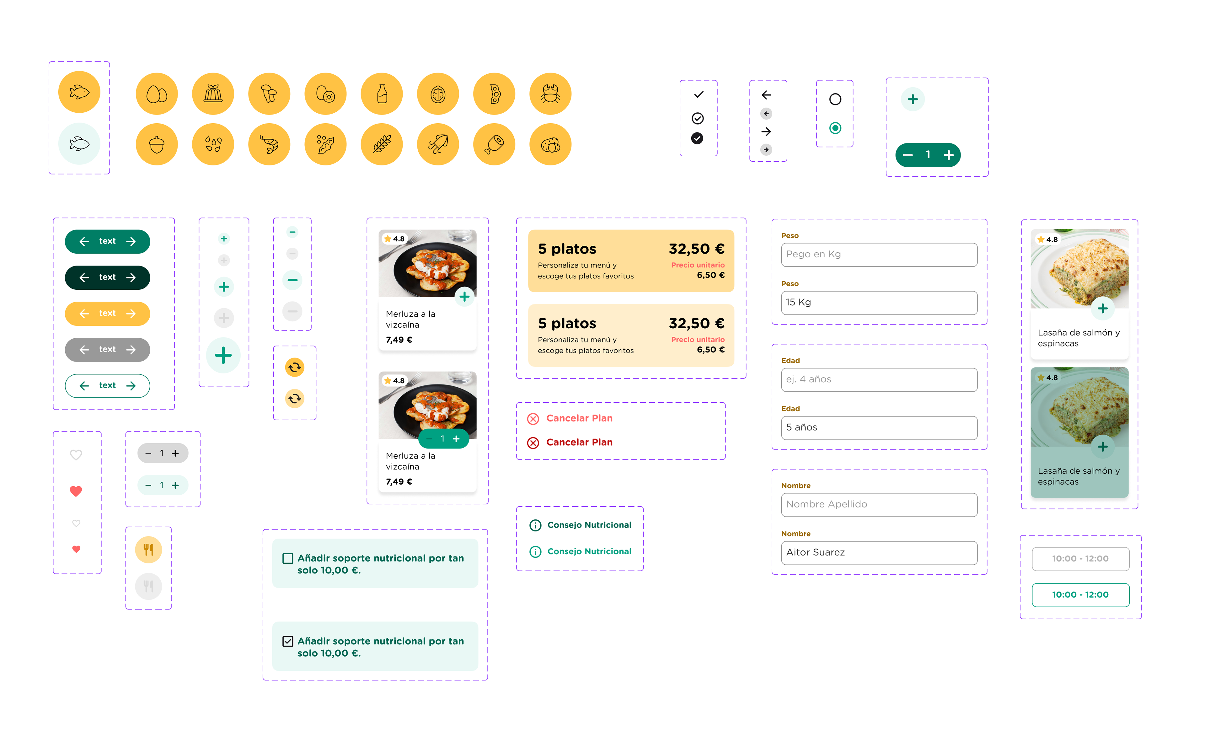 My role at this stage was to develop the family of icons related to foods that cause allergies. Additionally, I designed some of the buttons and organized the typographic styles of the visual system.