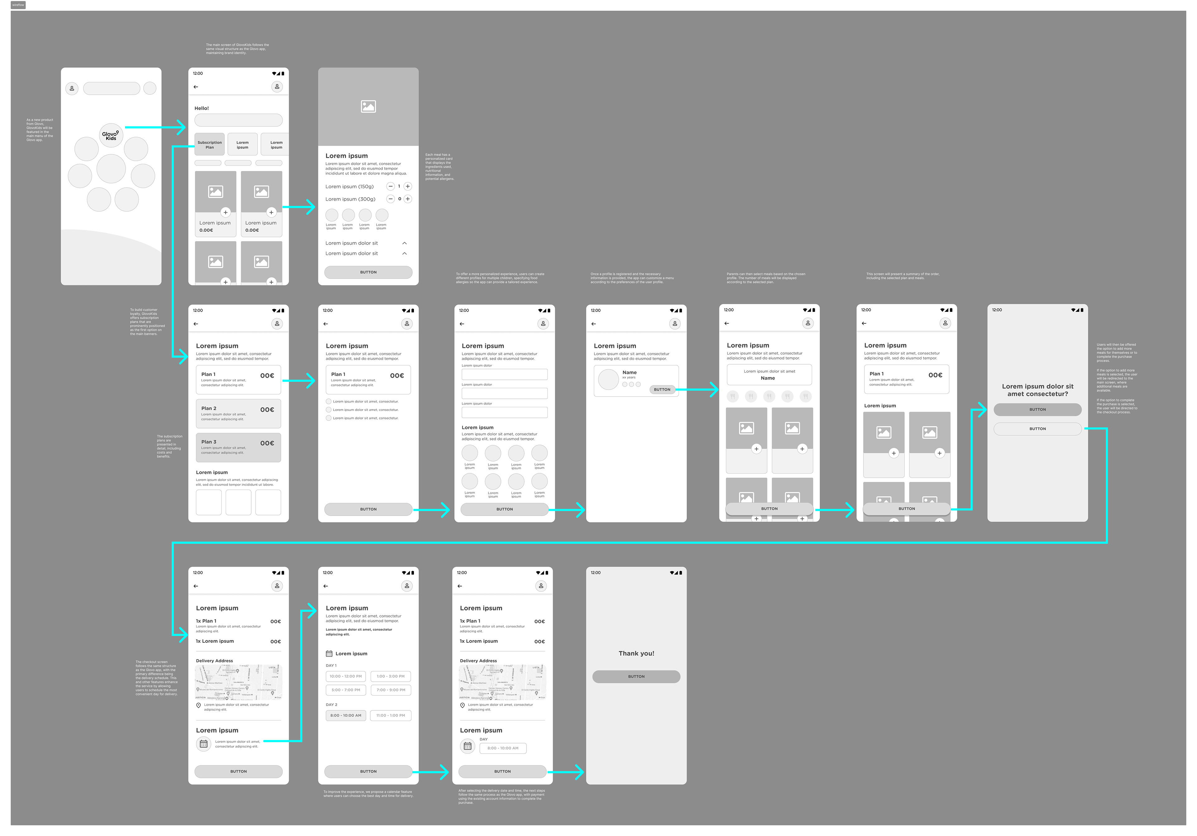 Wireflow showing the process of purchasing a subscription plan, starting from the Glovo app's home screen.