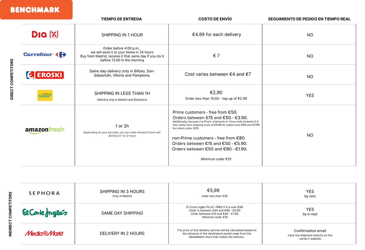 A second study[2] indicates that chains like Mercadona, Día, Carrefour, Alcampo, and Eroski dominate nearly half of the market. This analysis considered aspects such as national coverage, service cost, and delivery time.